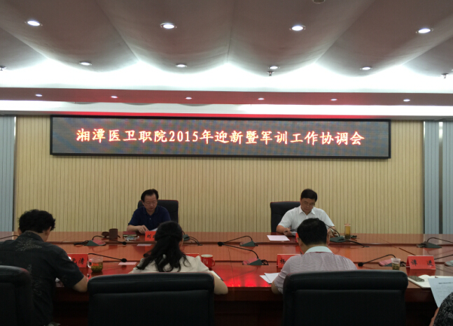 9月10日上午,我校在护理楼807会议室召开2015年迎新暨军训工作协调会。刘建强校长出席并讲话,左泽文副校长主持会议,学生工作处处长汪石果、武装部部长刘勇、团委书记彭玉京分别通报了开学迎新、军事训练、迎新晚会等工作情况,相关部门和二级学院主要负责人参加了会议。