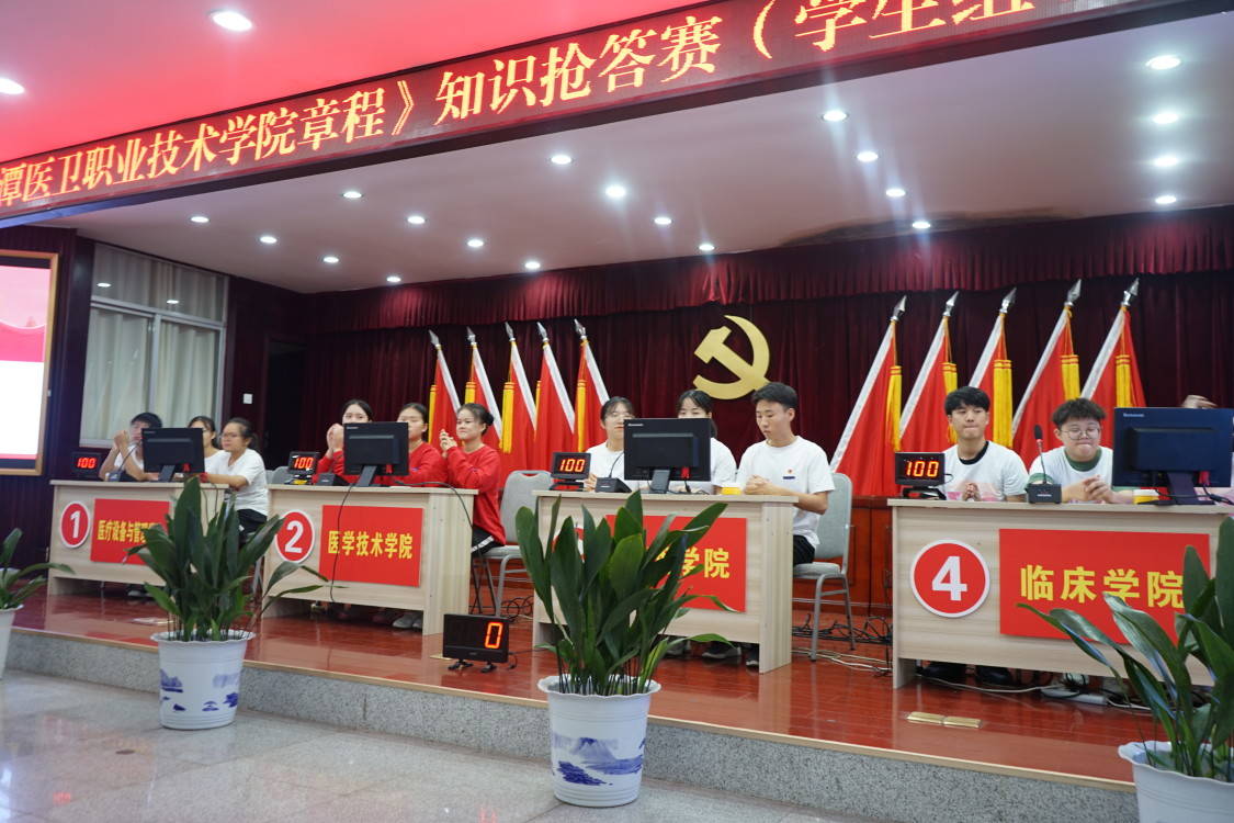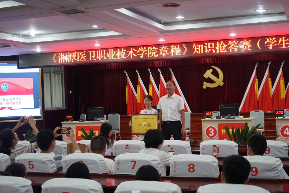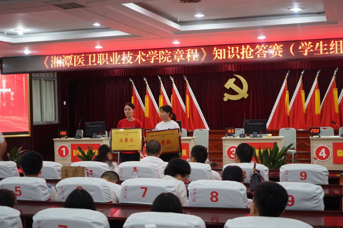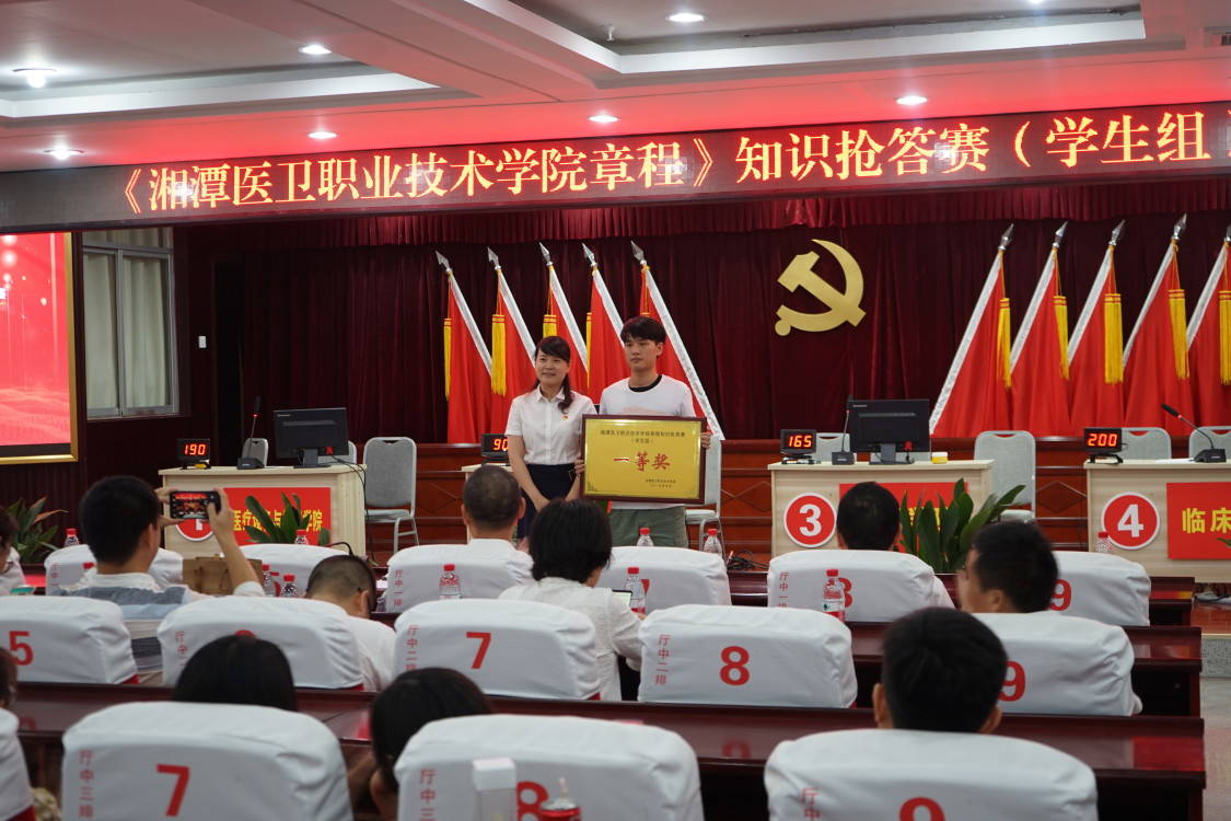 本次比赛一共四支学生代表队参加,采用现场竞赛,现场评比方式进行。比赛分必答题、抢答题、“心跳”题三种形式。各队在必答题环节稳扎稳打,展现出扎实知识理论功底;在抢答题环节,选手们争相抢答,逐渐拉大积分差距;在风险竞答环节,最为精彩,队员们卯足了劲奋力抢答,快速对答不时引发台下观众的掌声和欢呼声。经过激烈角逐,最终临床学院代表队以200分夺得一等奖;医管学院以190分荣获二等奖;护理学院和医技学院分别以165分和90分获三等奖。赛后,与会领导为获奖代表队进行了颁奖。