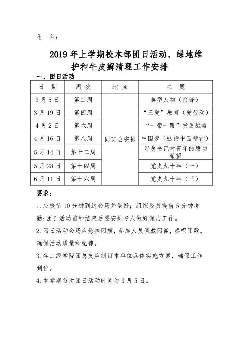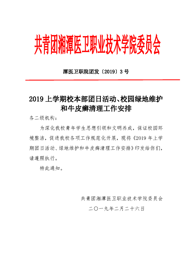 潭医卫职院团发[2019]3号:2019年上学期团日活动、绿地维护、牛皮癣清理安排表