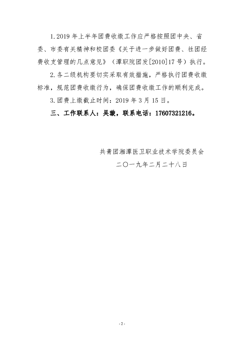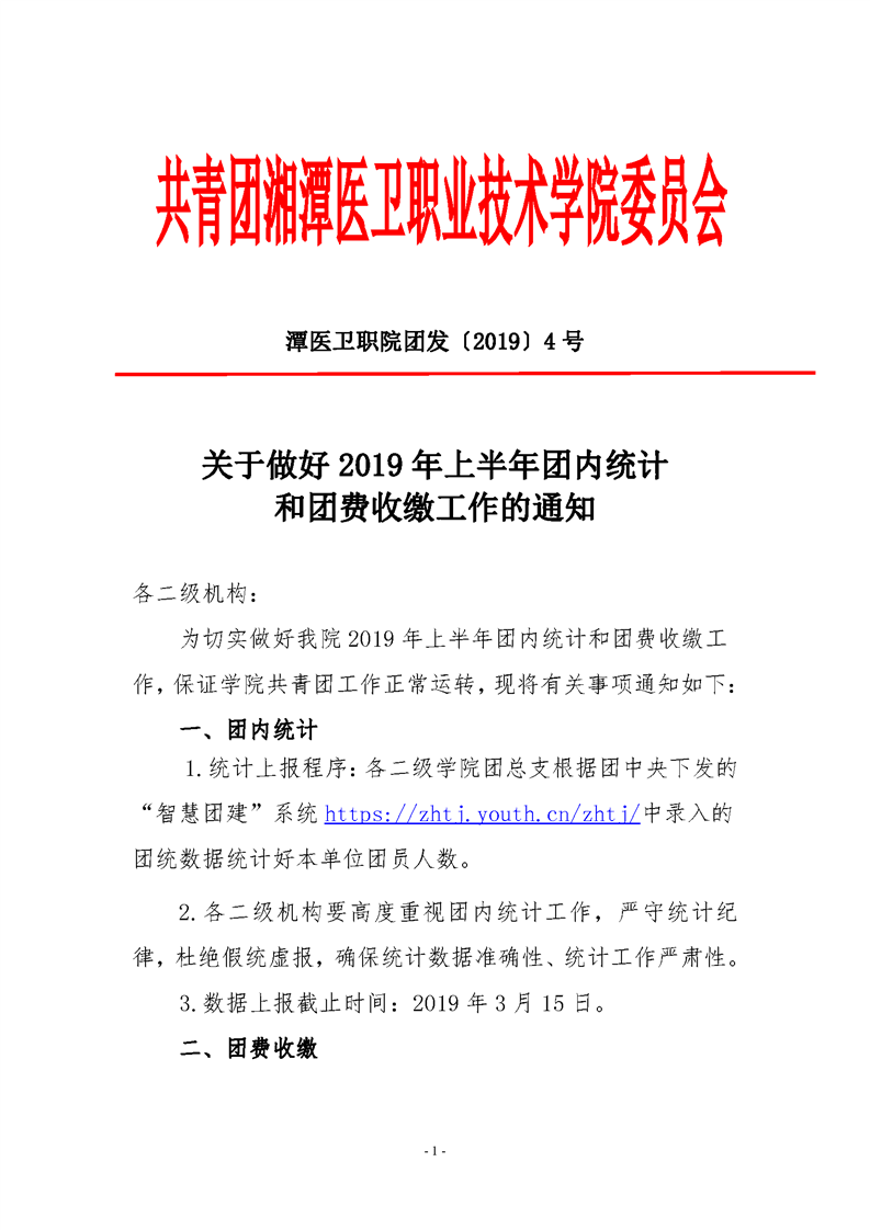 潭医卫职院团发[2019]4号:关于做好2019年上半年团内统计和团费收缴工作的通知