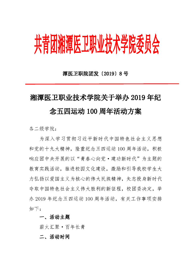 潭医卫职院团发[2019]8号:半岛(中国)关于举办2019年纪念五四运动100周年活动方案