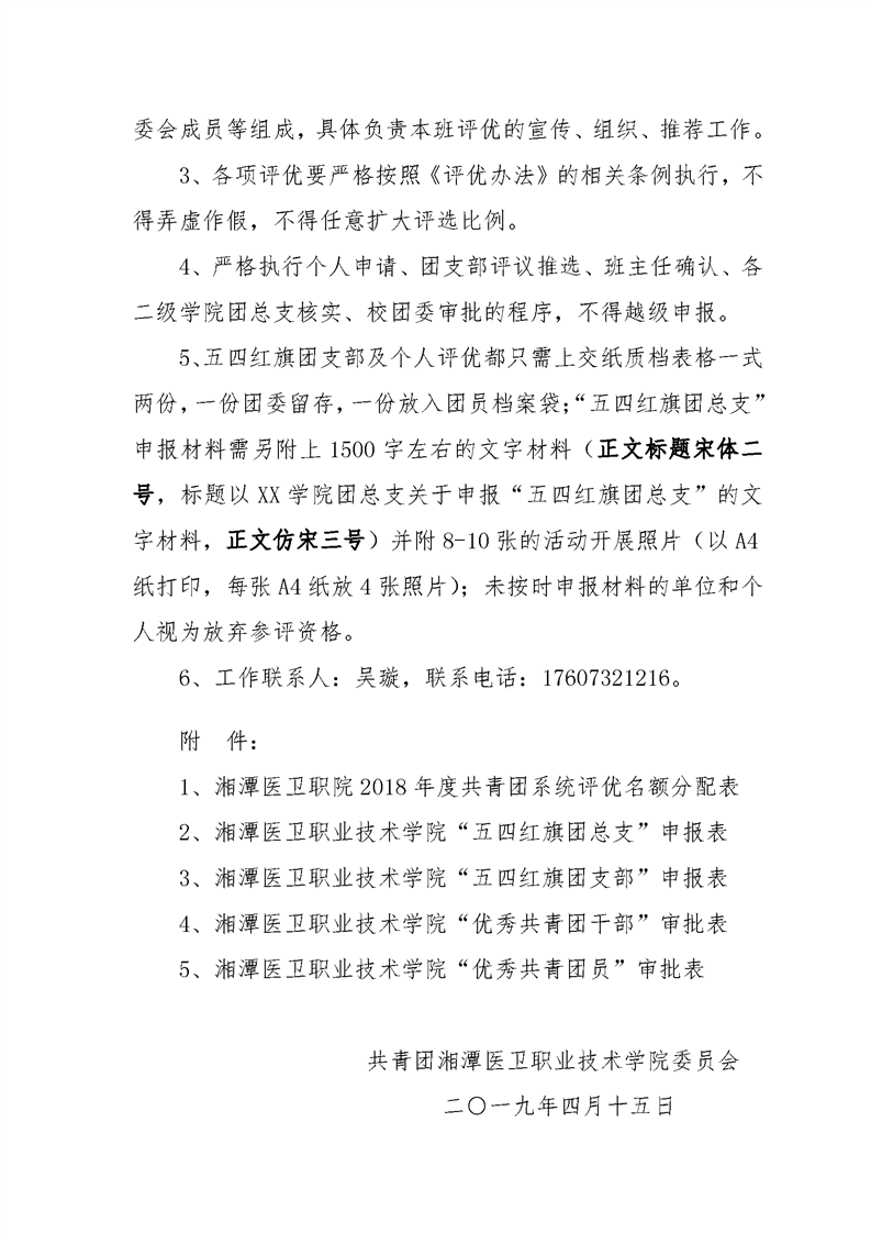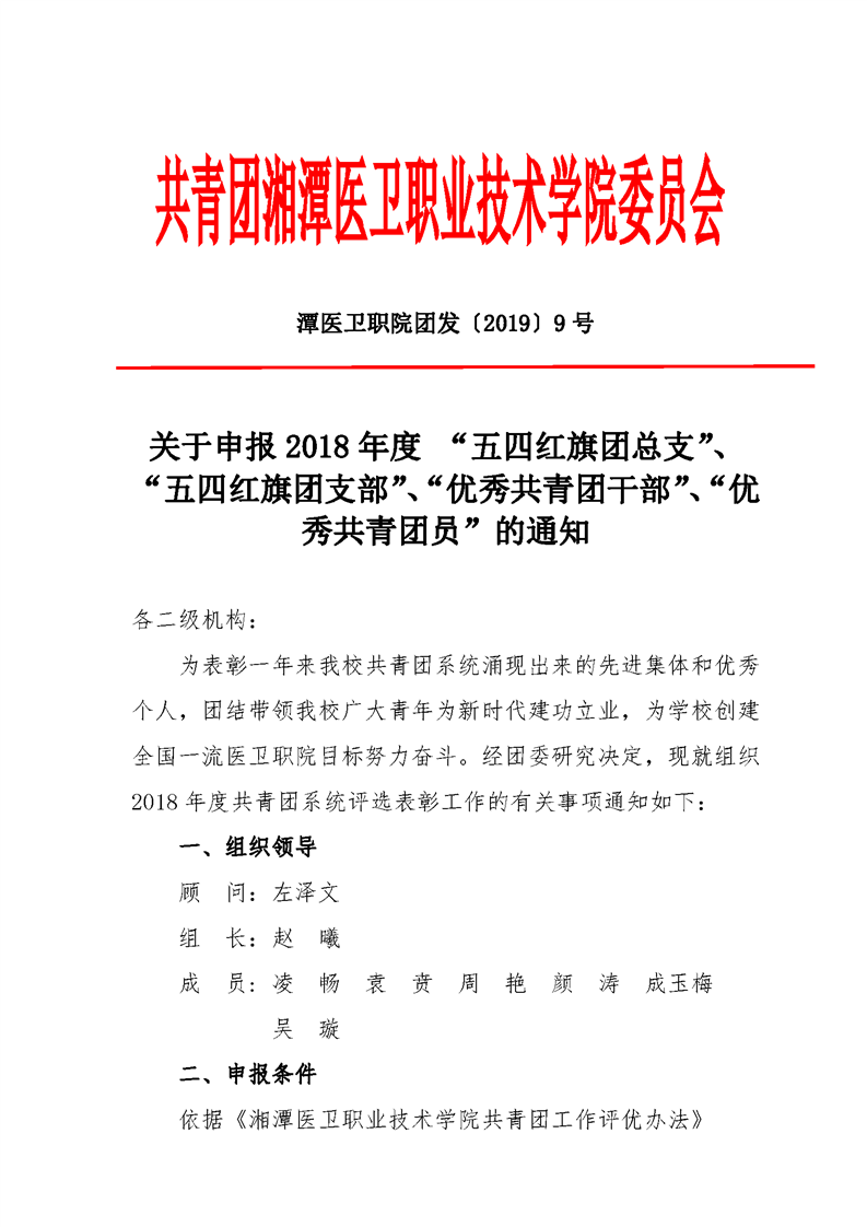 潭医卫职院团发[2019]9号:关于申报2018年度“五四红旗团总支”、“五四红旗团支部”、“优秀共