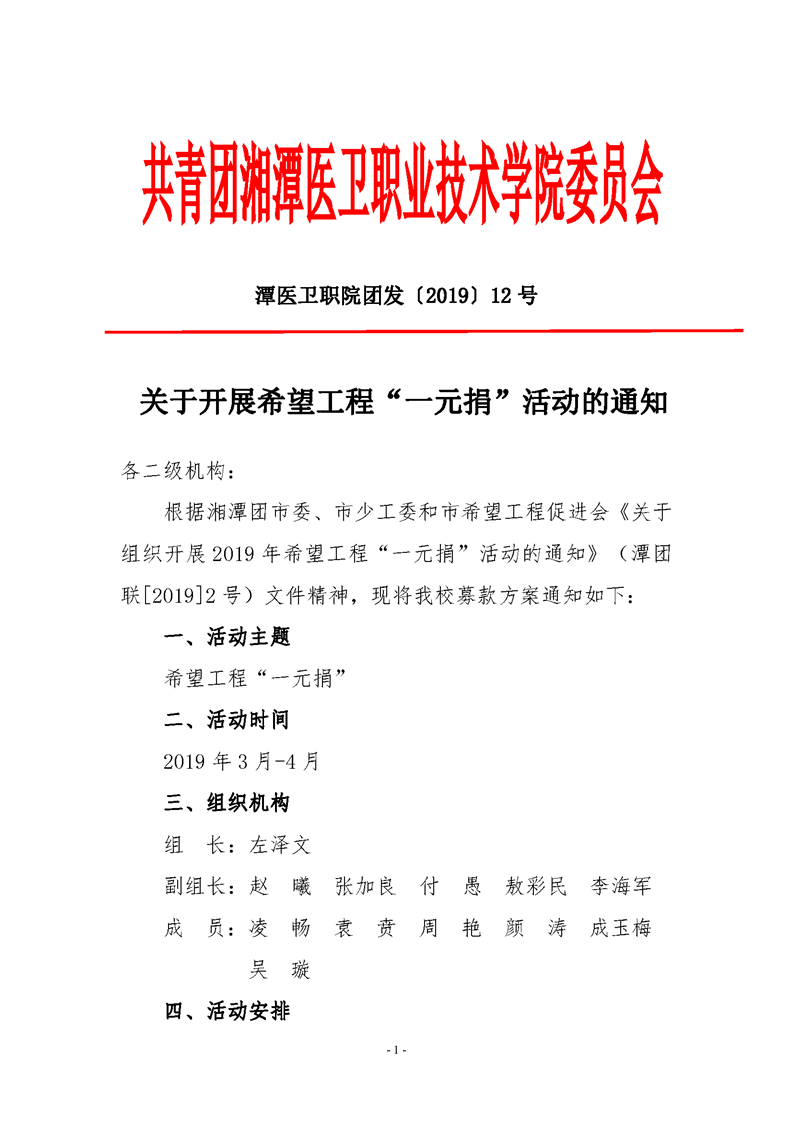 潭医卫职院团发[2019]12号:关于开展希望工程“一元捐”活动的通知