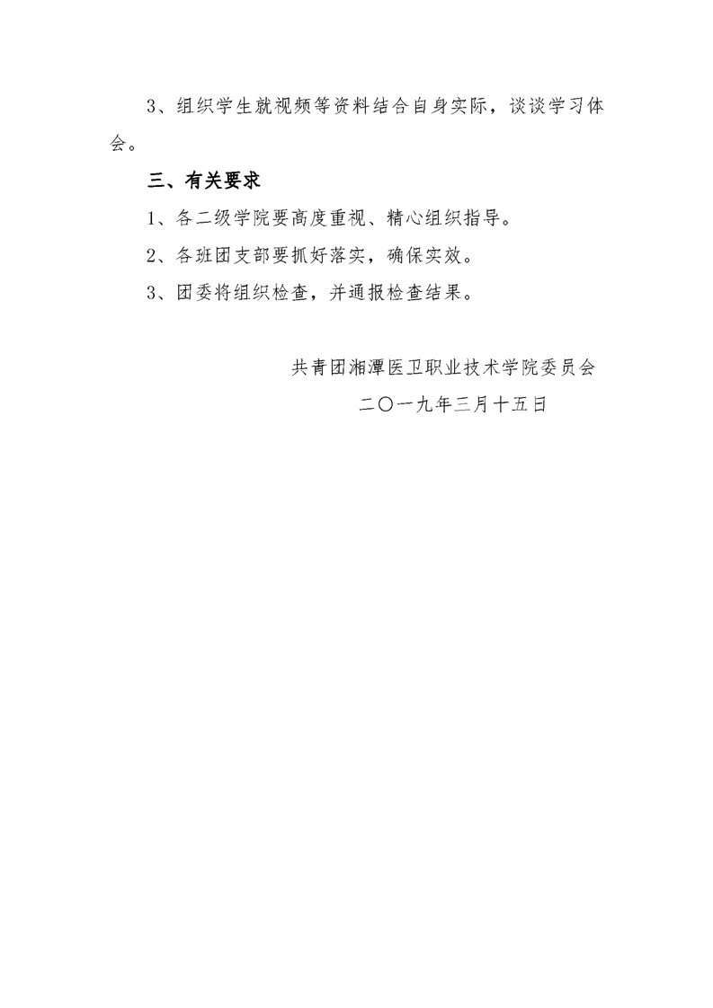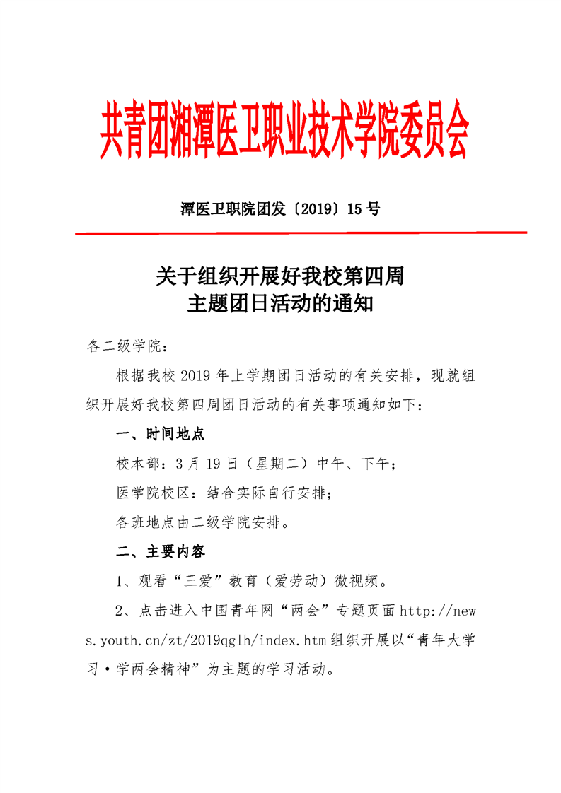 潭医卫职院团发[2019]15号:关于组织开展好我校第四周主题团日活动的通知