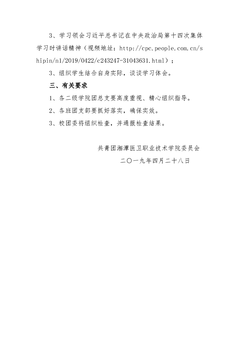 潭医卫职院团发[2019]20号:关于组织开展好我校第十周主题团日活动的通知