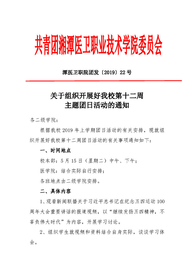 潭医卫职院团发[2019]22号:关于组织开展好我校第十二周主题团日活动的通知