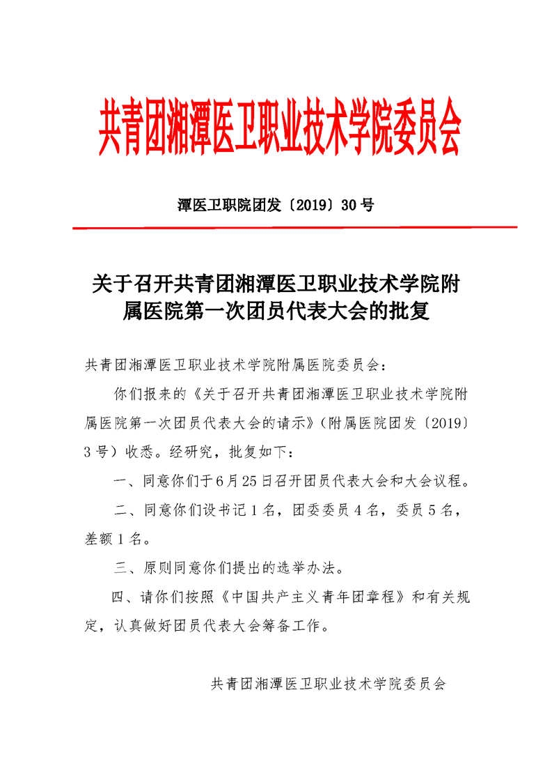 潭医卫职院团发[2019]30号:关于召开共青团半岛(中国)附属医院第一次团员代表大会的批复