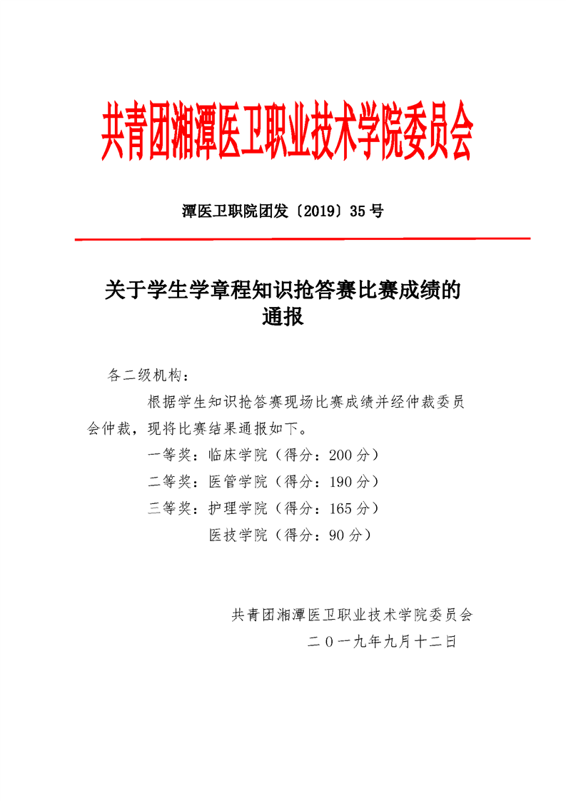 潭医卫职院团发[2019]35号:关于学生学章程知识抢答赛比赛成绩的通报