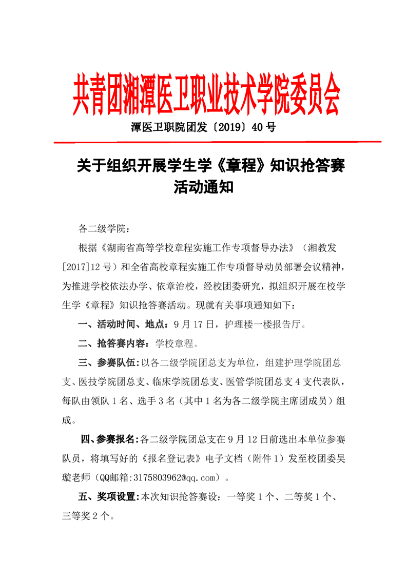 潭医卫职院团发[2019]40号:学生学章程知识抢答赛通知