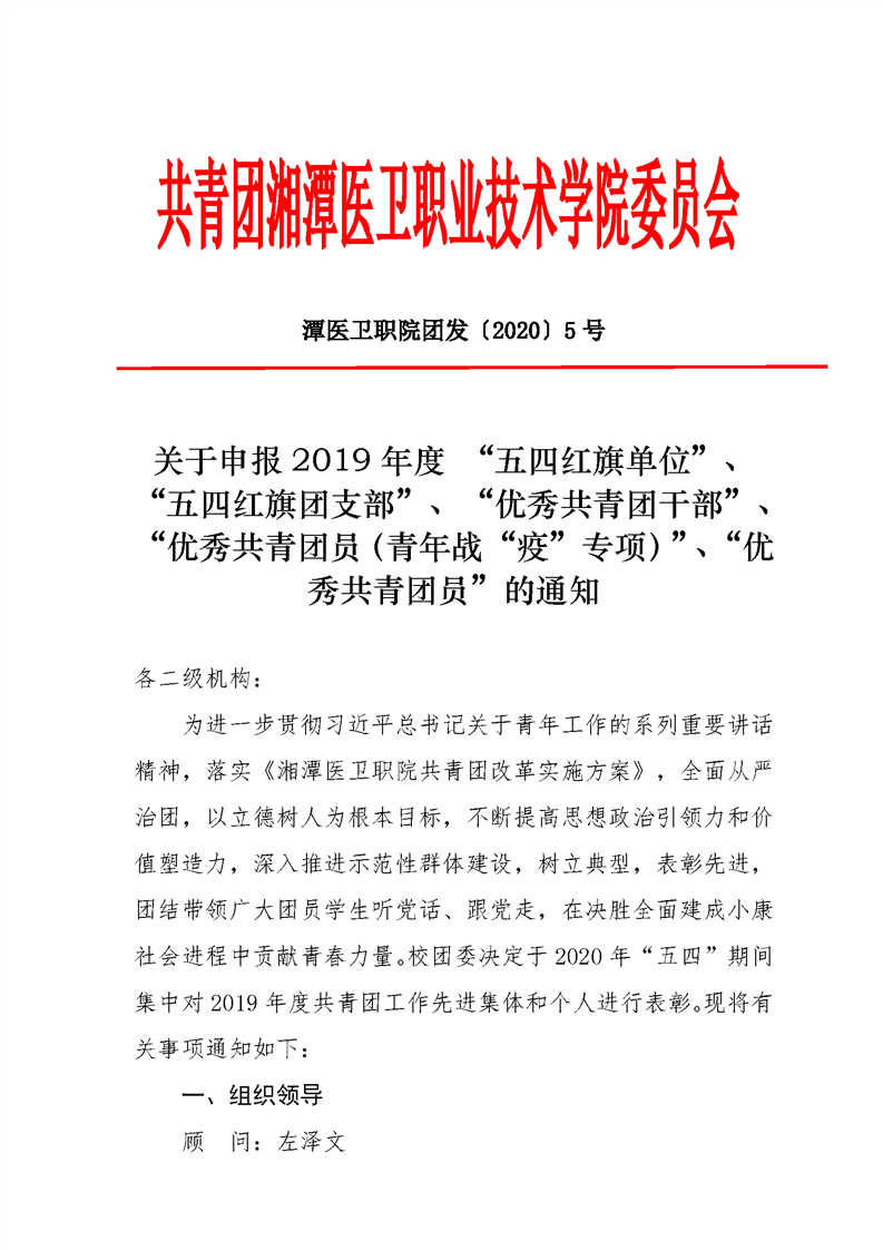 潭医卫职院团发[2020]5号:关于申报2019年度五四红旗单位、五四红旗团支部、优秀共青团员的通知