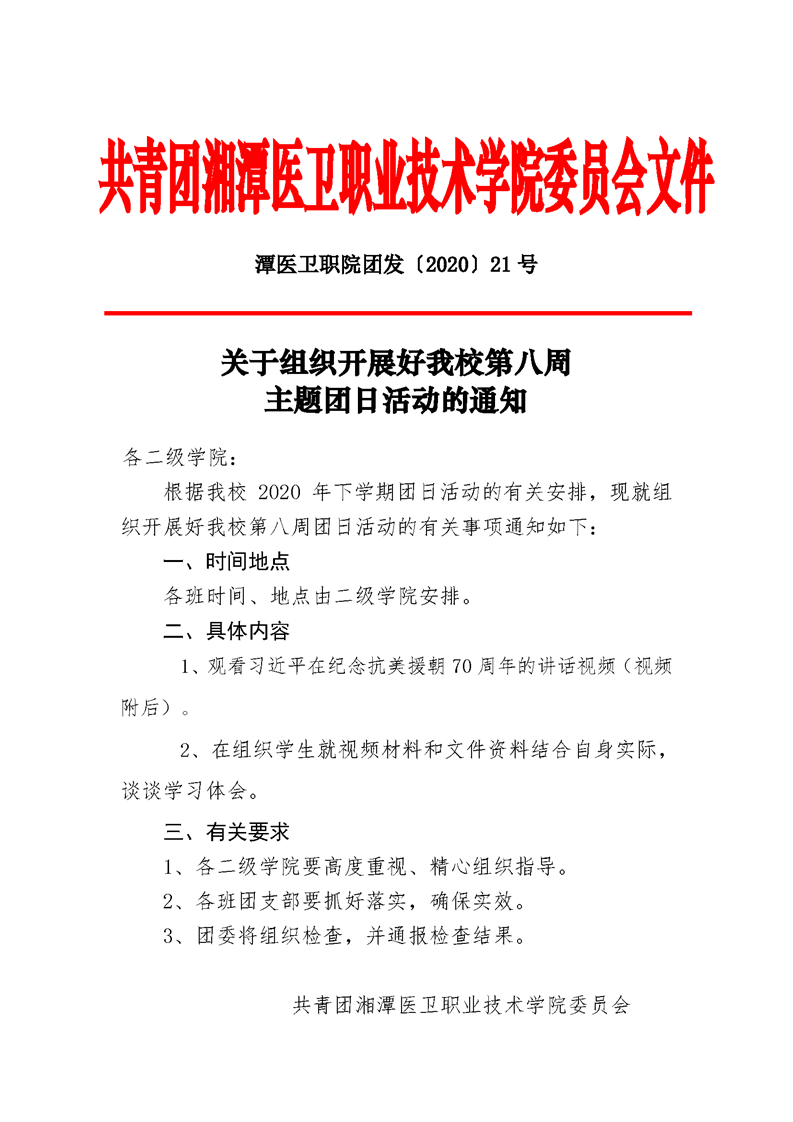 潭医卫职院团发[2020]21号:关于组织开展好我校第八周主题团日活动的通知