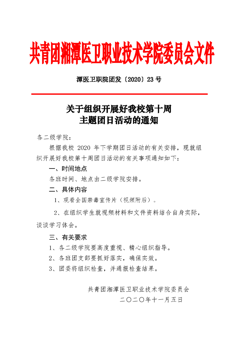 潭医卫职院团发[2020]23号:关于组织开展好我校第十周主题团日活动的通知