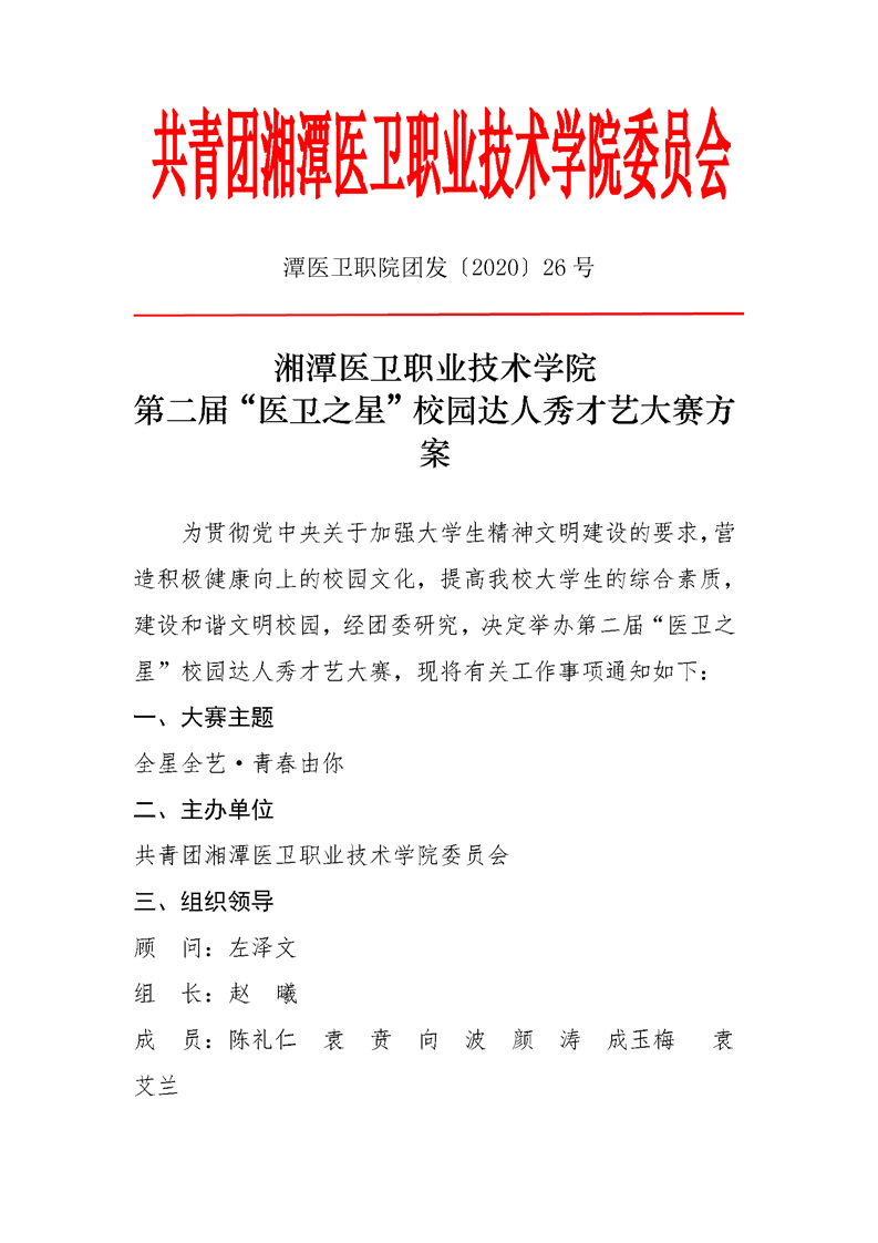 潭医卫职院团发[2020]26号:湘潭医卫第二届“医卫之星”校园达人秀才艺大赛方案