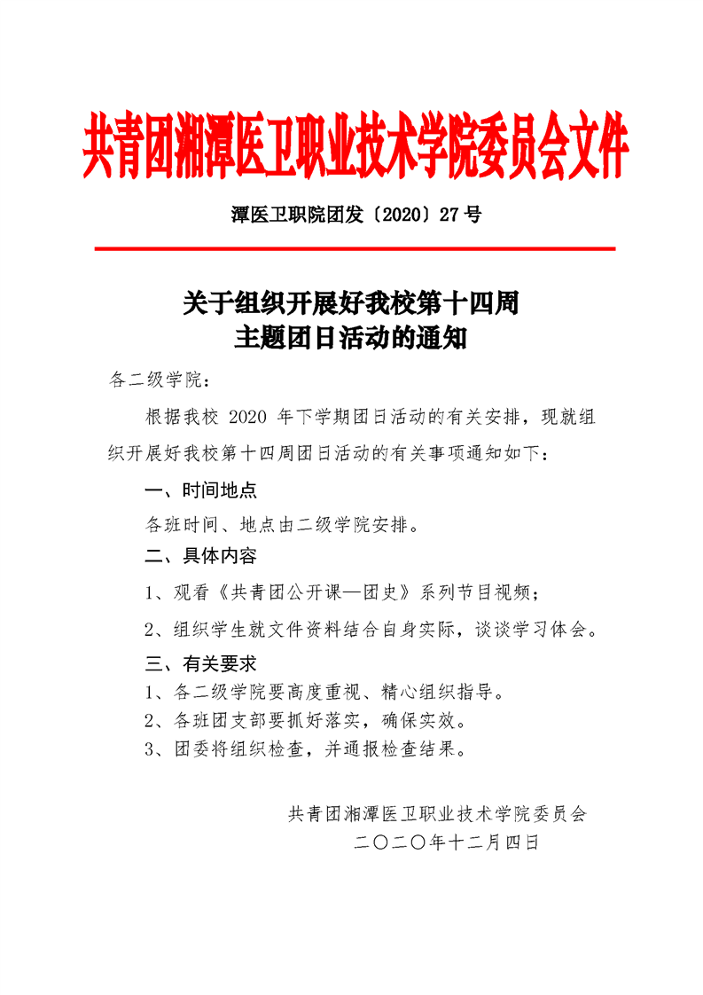 潭医卫职院团发[2020]27号:关于组织开展好我校第十四周主题团日活动的通知