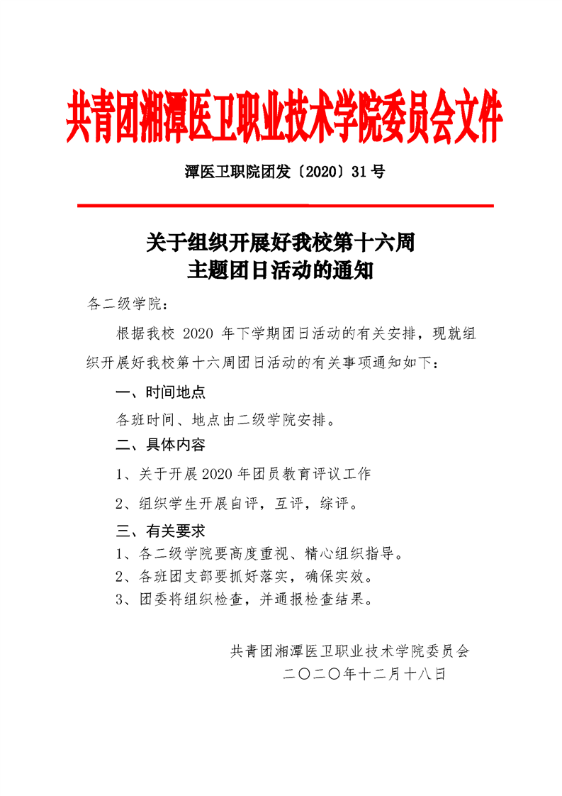 潭医卫职院团发[2020]31号:关于组织开展好我校第十六周主题团日活动的通知