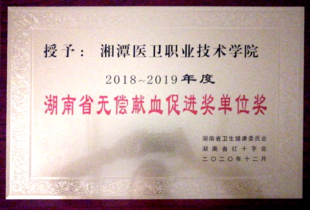此次表彰由湖南省卫生健康委员会与湖南红十字会联合授予,全省共评选出无偿献血促进奖单位奖58个。我校积极响应国家无偿献血的号召,充分发挥医学院校专业优势,通过志愿服务建设加大对无偿献血的宣传力度,营造了浓厚的氛围。