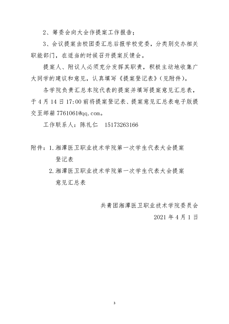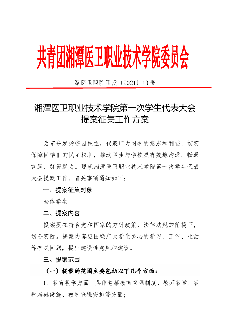 潭医卫职院团发[2021]13号:半岛(中国)第一次学生代表大会提案征集工作方案