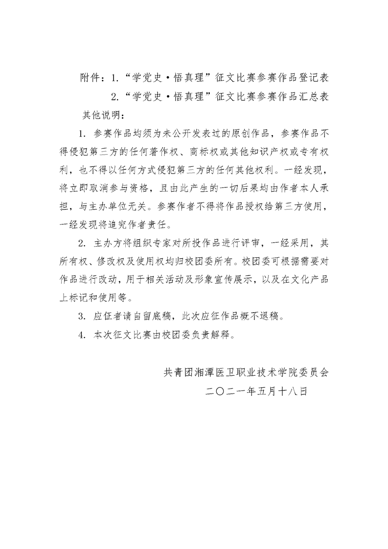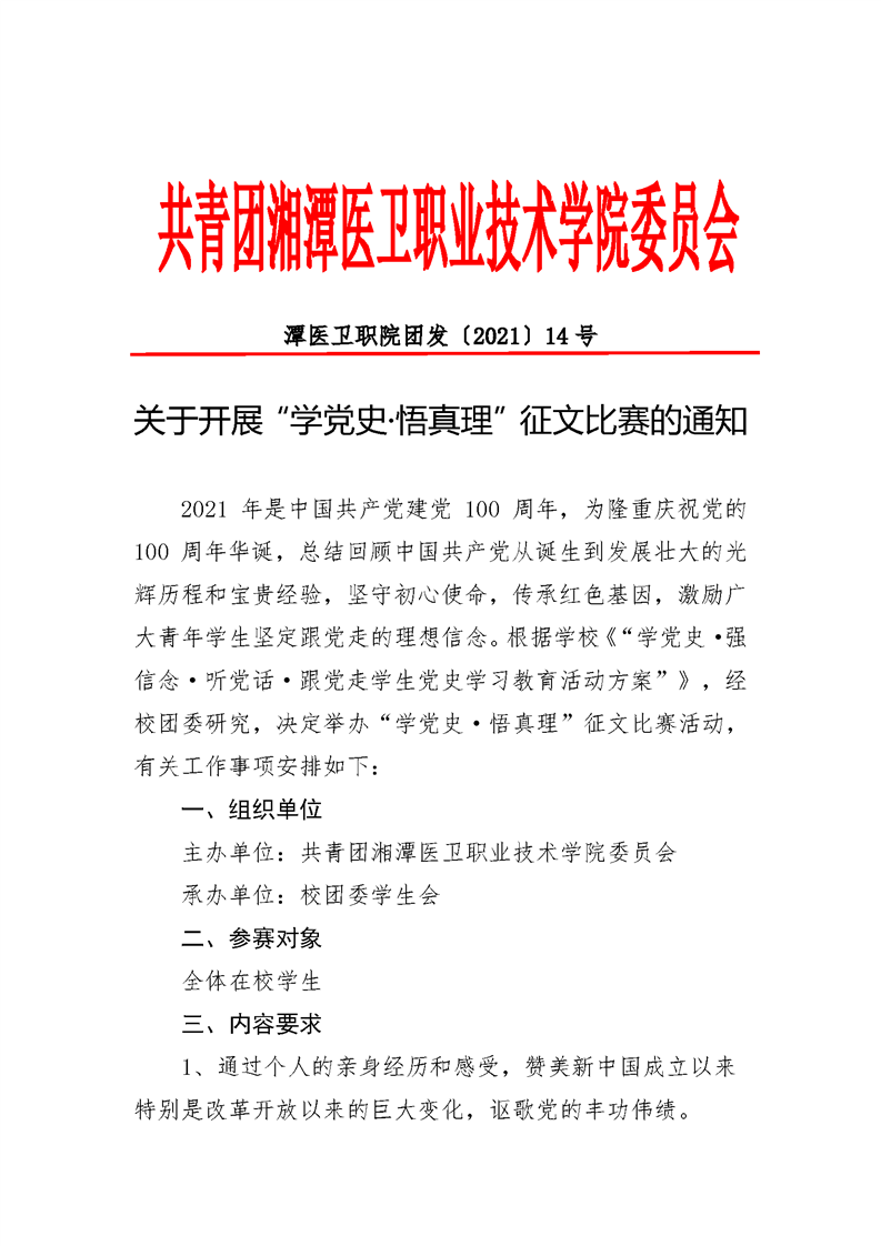 潭医卫职院团发[2021]14号:“学党史·悟真理”征文比赛活动