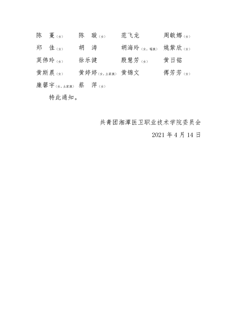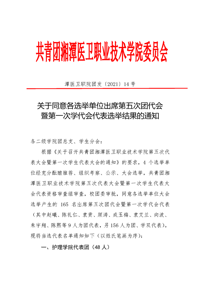 潭医卫职院团发[2021]14号:关于同意各选举单位出席第五次团代会暨第一次学代会代表选举结果的通知