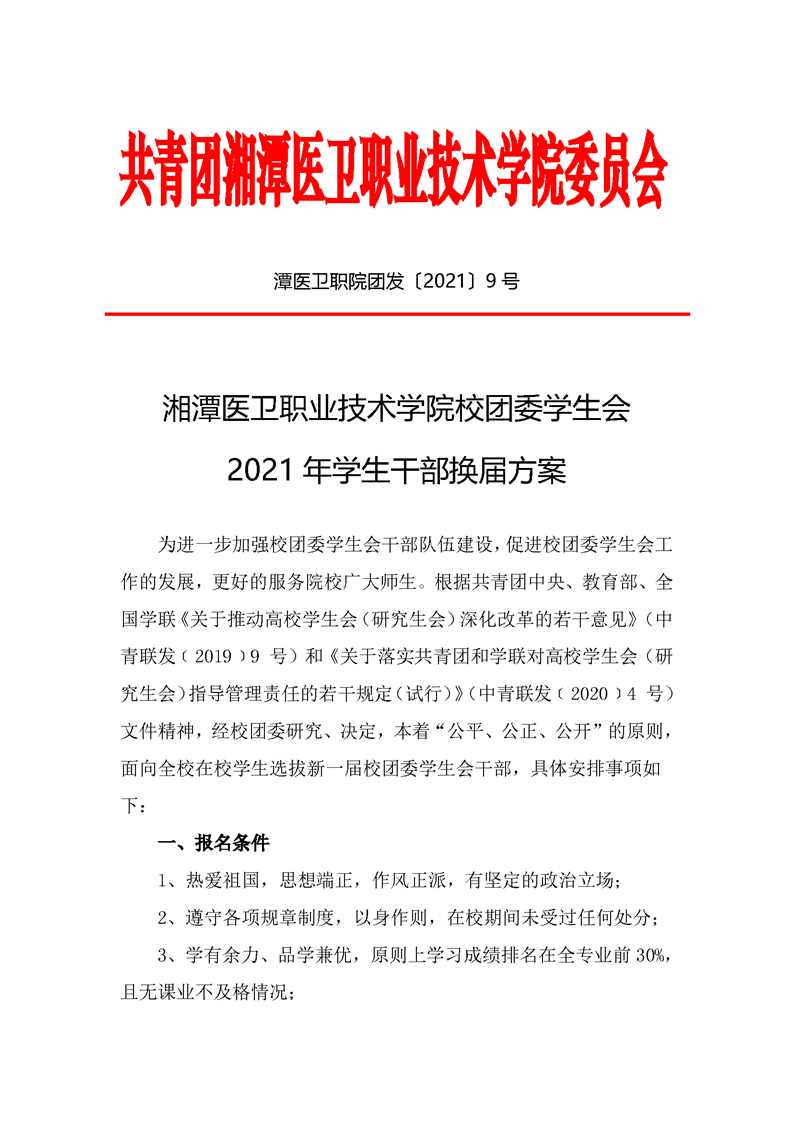 潭医卫职院团发[2021]17号:半岛(中国)校团委学生会2021年学生干部换届方案