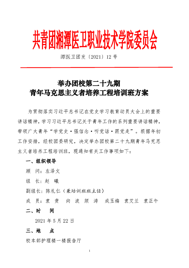 潭医卫职院团发[2021]20号:关于举办团校第二十九期青年马克思主义者培养工程培训班的通知(改)