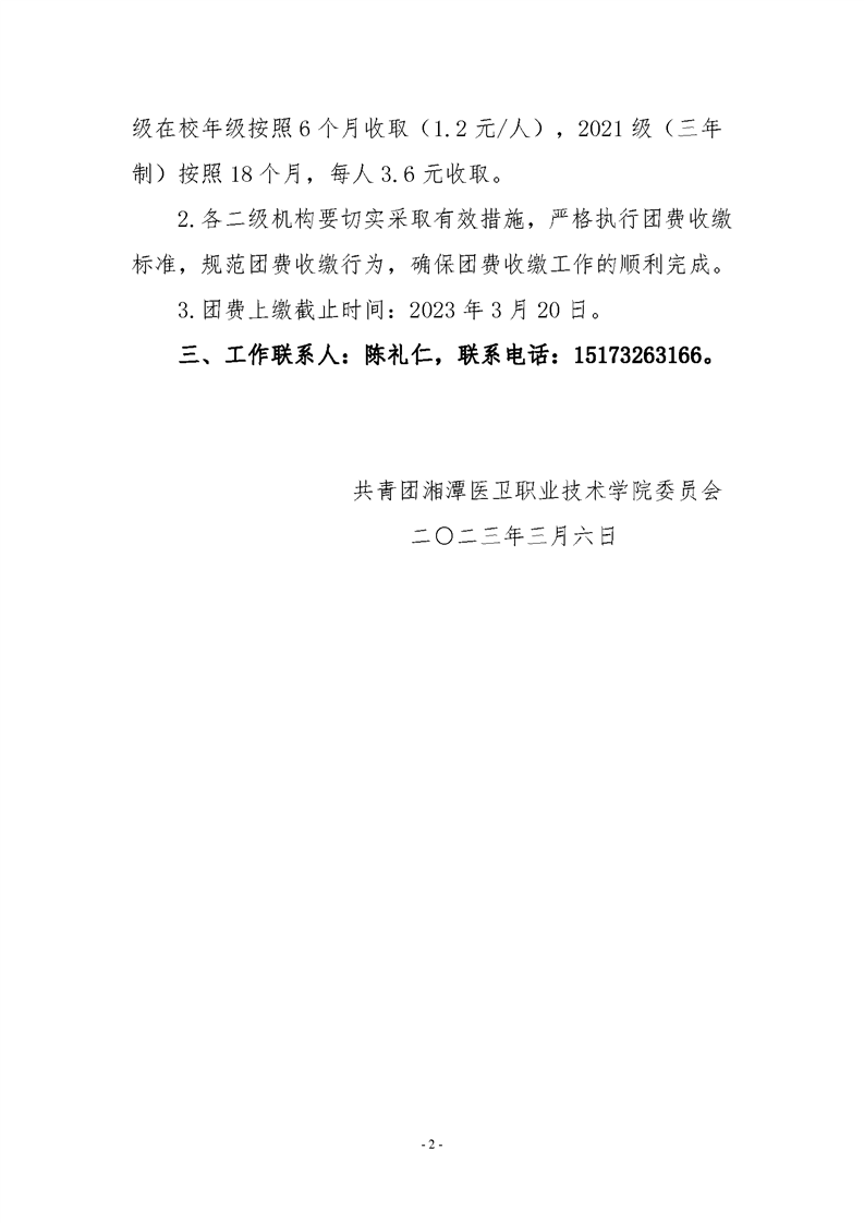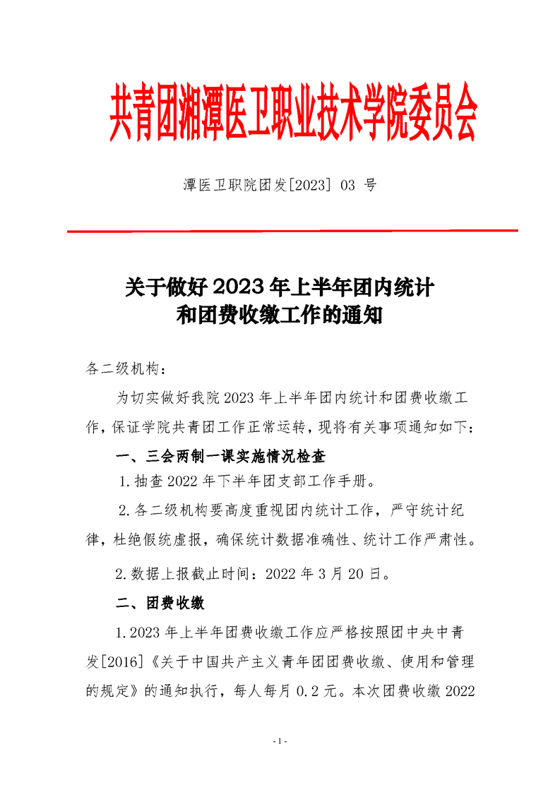 潭医卫职院团发[2023]03号:关于做好2023年上半年团内统计和团费收缴工作的通知