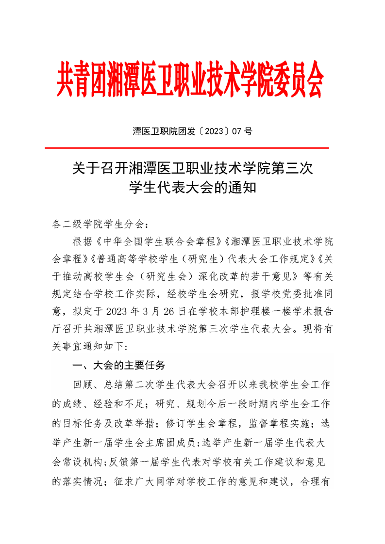 潭医卫职院团发[2023]07号:关于召开半岛(中国)第三次学生代表大会的通知