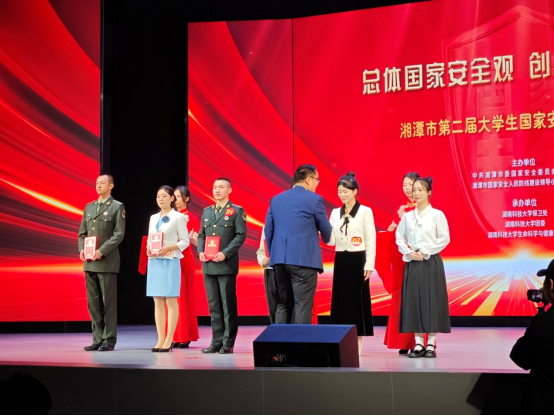 4月14日,湘潭市第二届大学生国家安全主题演讲比赛在湖南科技大学举行,市委常委、政法委书记袁新天出席活动并为获奖选手颁奖。