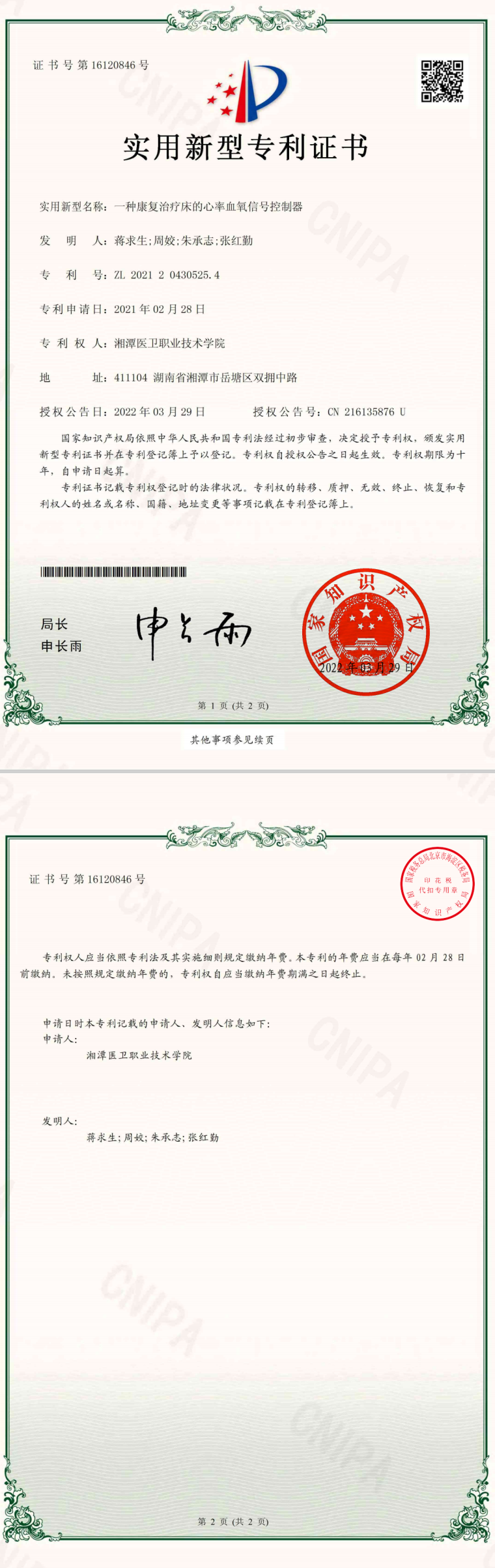 一种康复治疗床的心率血氧信号控制器-实用新型专利证书