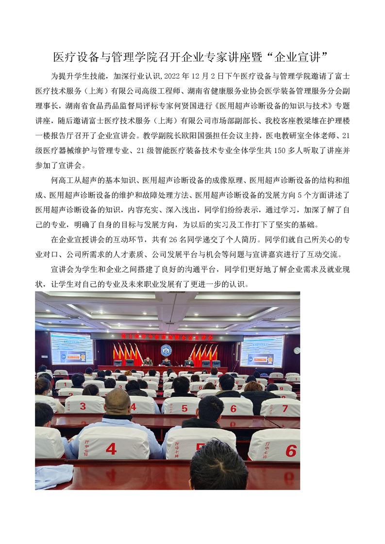 医疗设备与管理学院召开企业专家讲座暨“企业宣讲”