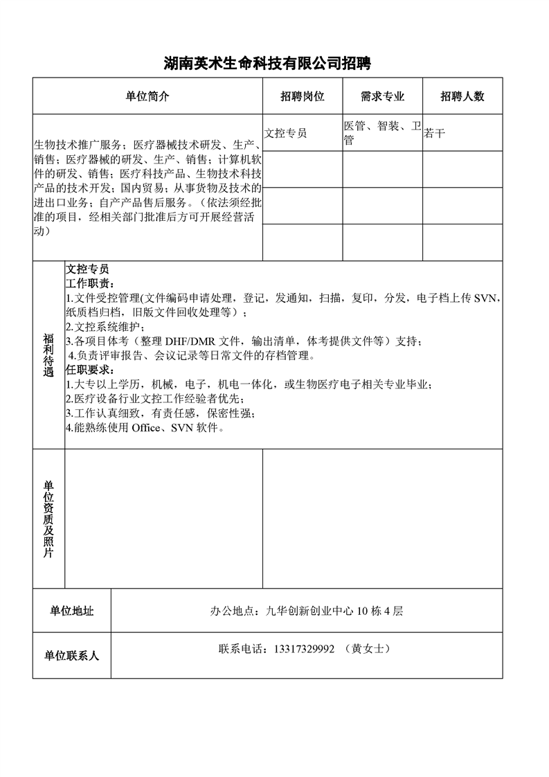 湖南英术生命科技有限公司招聘