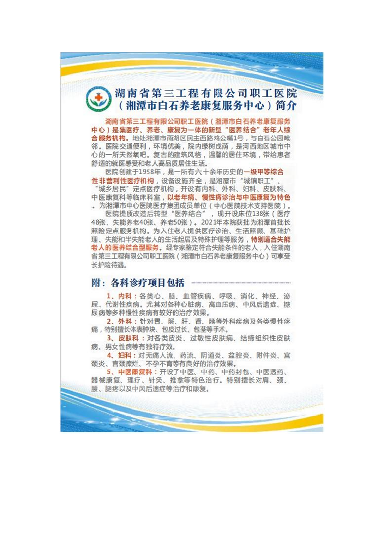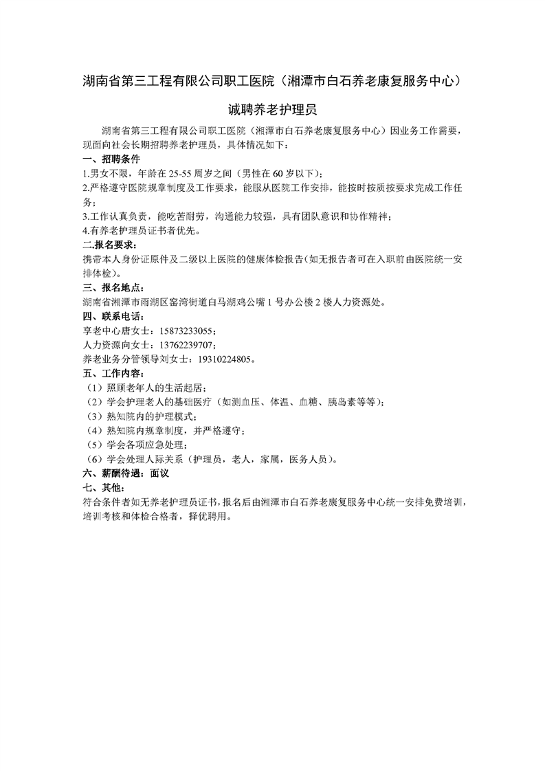 湖南省第三工程有限公司职工医院(湘潭市白石养老康复服务中心)招聘公告