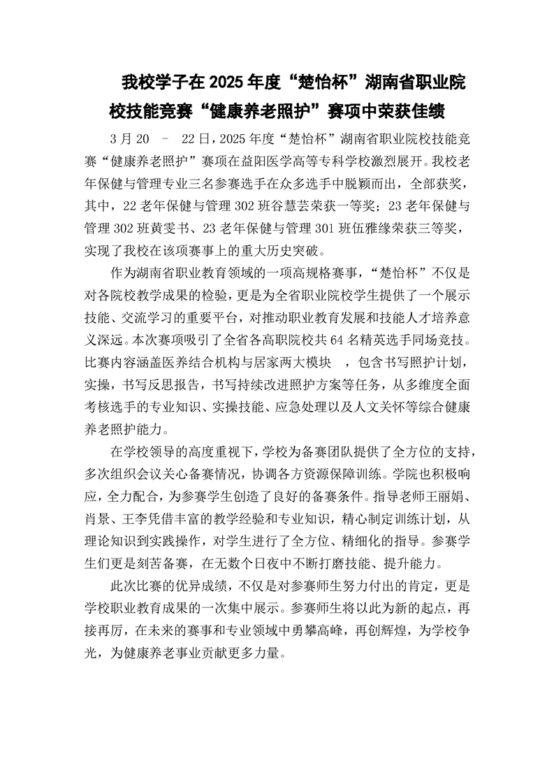 我校学子在2025年度“楚怡杯”湖南省职业院校技能竞赛“健康养老照护”赛项中荣获佳绩