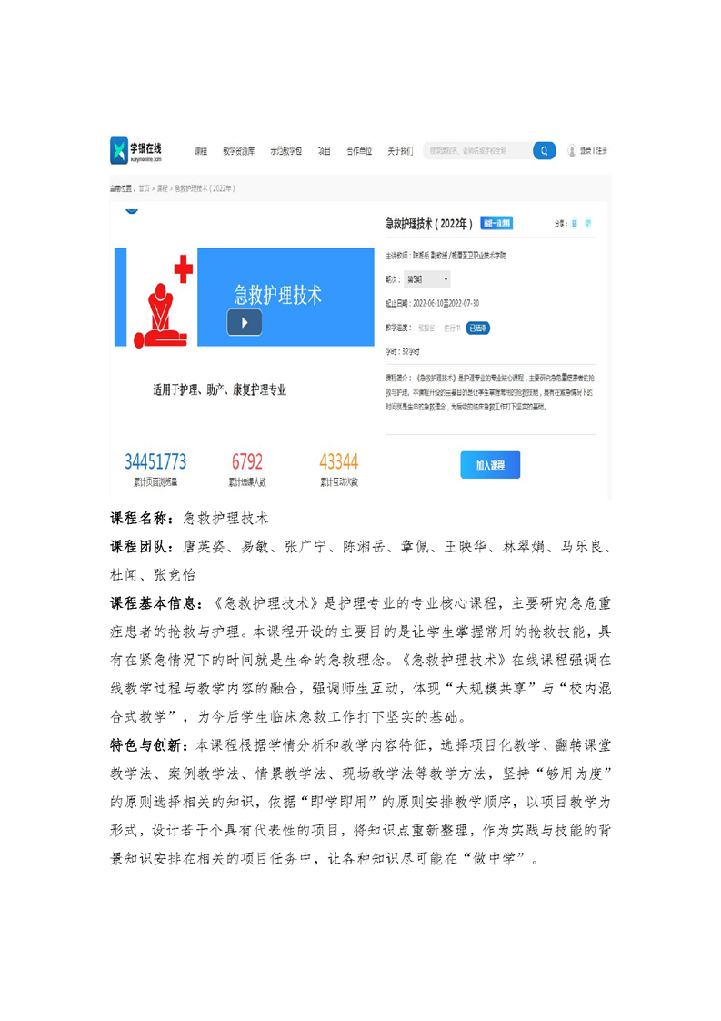 省级在线精品课程:《急救护理技术》