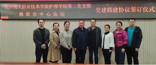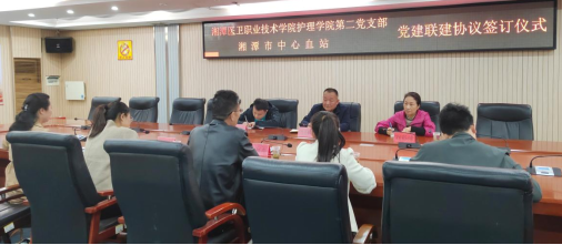 4 月 7 日,护理学院第二党支部与湘潭市中心血站在护理学院八楼会议室召开党建联建会议。此次会议由护理学院党总支书记李海军主持,湘潭市中心血站站长周祖皇,献血管理科主任刘彩球、副主任陈希俊和护理学院第二党支部书记付雪连、党员穆亚敏、邹润海、唐英姿等出席了会议。
