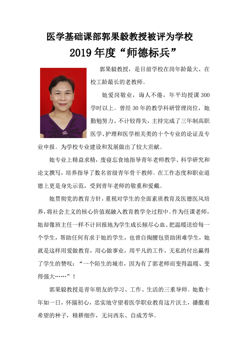医学基础课部郭果毅教授被评为半岛平台2019年度“师德标兵”