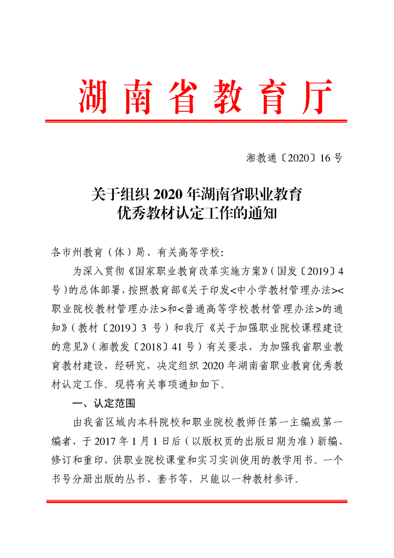 转《关于组织2020年湖南省职业教育优秀教材认定工作的通知》