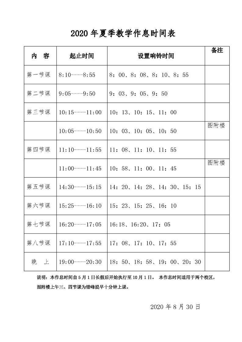 2020年夏季作息时间表