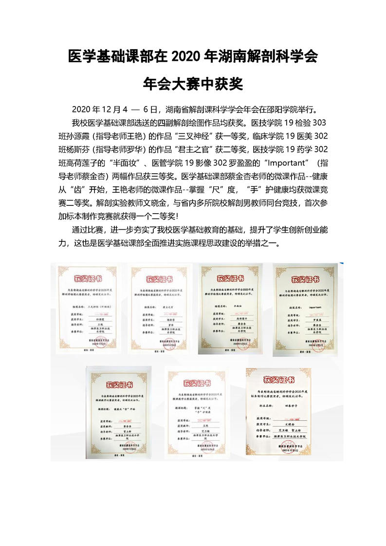 医学基础课部在202020年湖南解剖科学会年会大赛中获奖