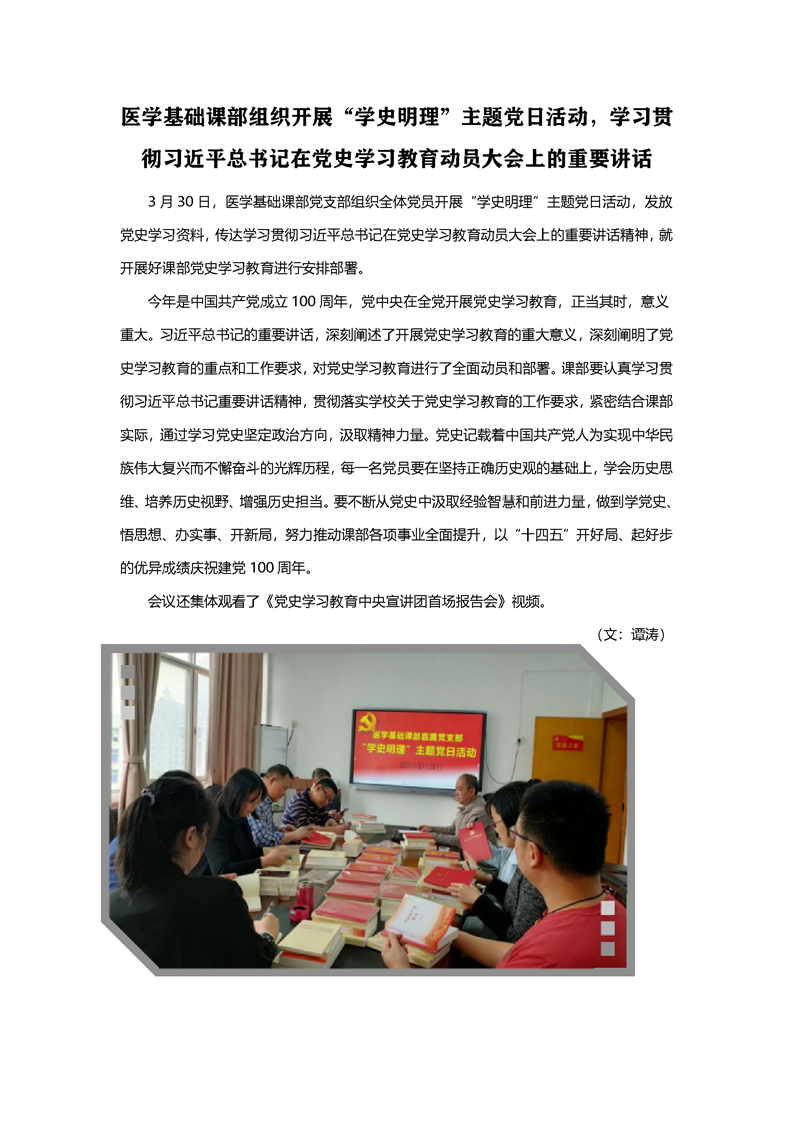 医学基础课部组织开展“学史明理”主题党日活动,学习贯彻习近平总书记在党史学习教育动员大会上的重要讲话