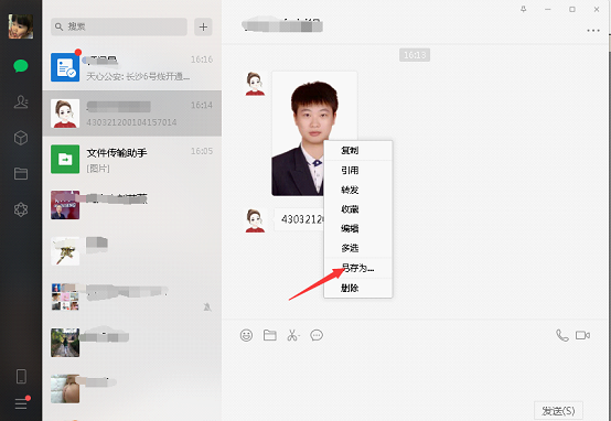 另外,在照片采集时一般通过微信拍照发送照片较多。发送照片时需把证件号码一起发送过来,收集照片的人员可以登录电脑端微信,右键点击发过来的照片,选择另存为,把照片另存至目标文件夹,另存为时一并可以把照片名改成身份证号码命名。收集完毕后把该文件夹压缩打包再发送即可。