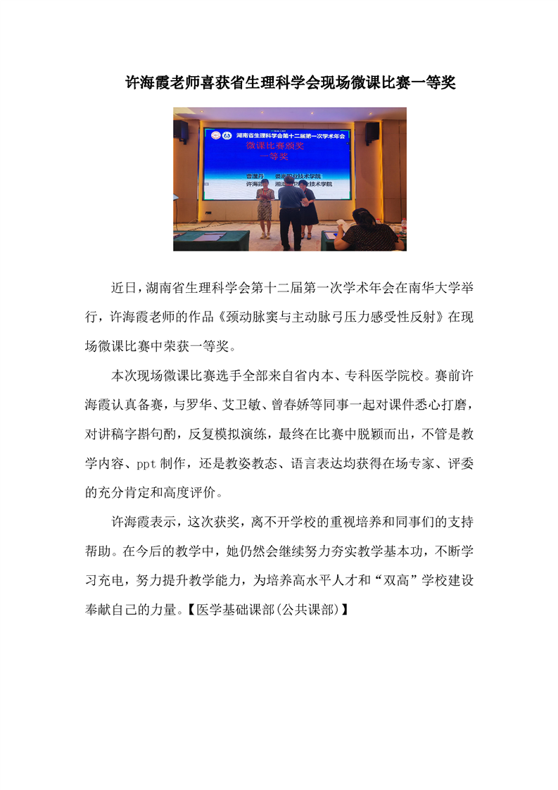 我校老师喜获湖南省生理科学会现场微课比赛一等奖