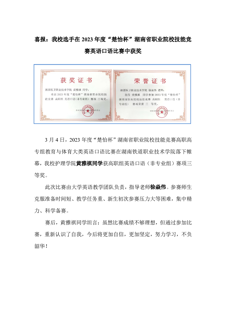 喜报:我校选手在2023年度“楚怡杯”湖南省职业院校技能竞赛英语口语比赛中获奖