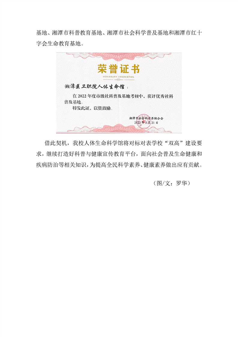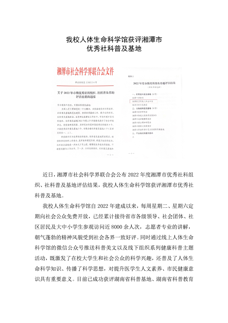 我校人体生命科学馆获评湘潭市优秀社科普及基地