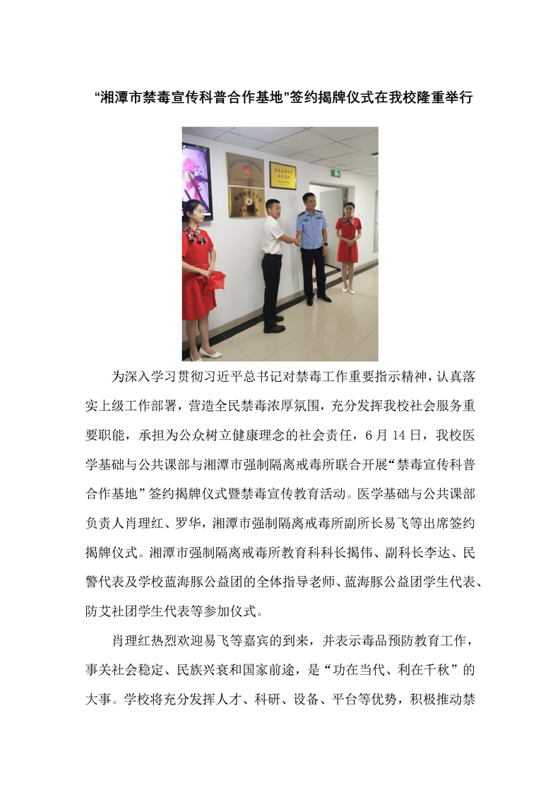 “湘潭市禁毒宣传科普合作基地”签约揭牌仪式在我校隆重举行